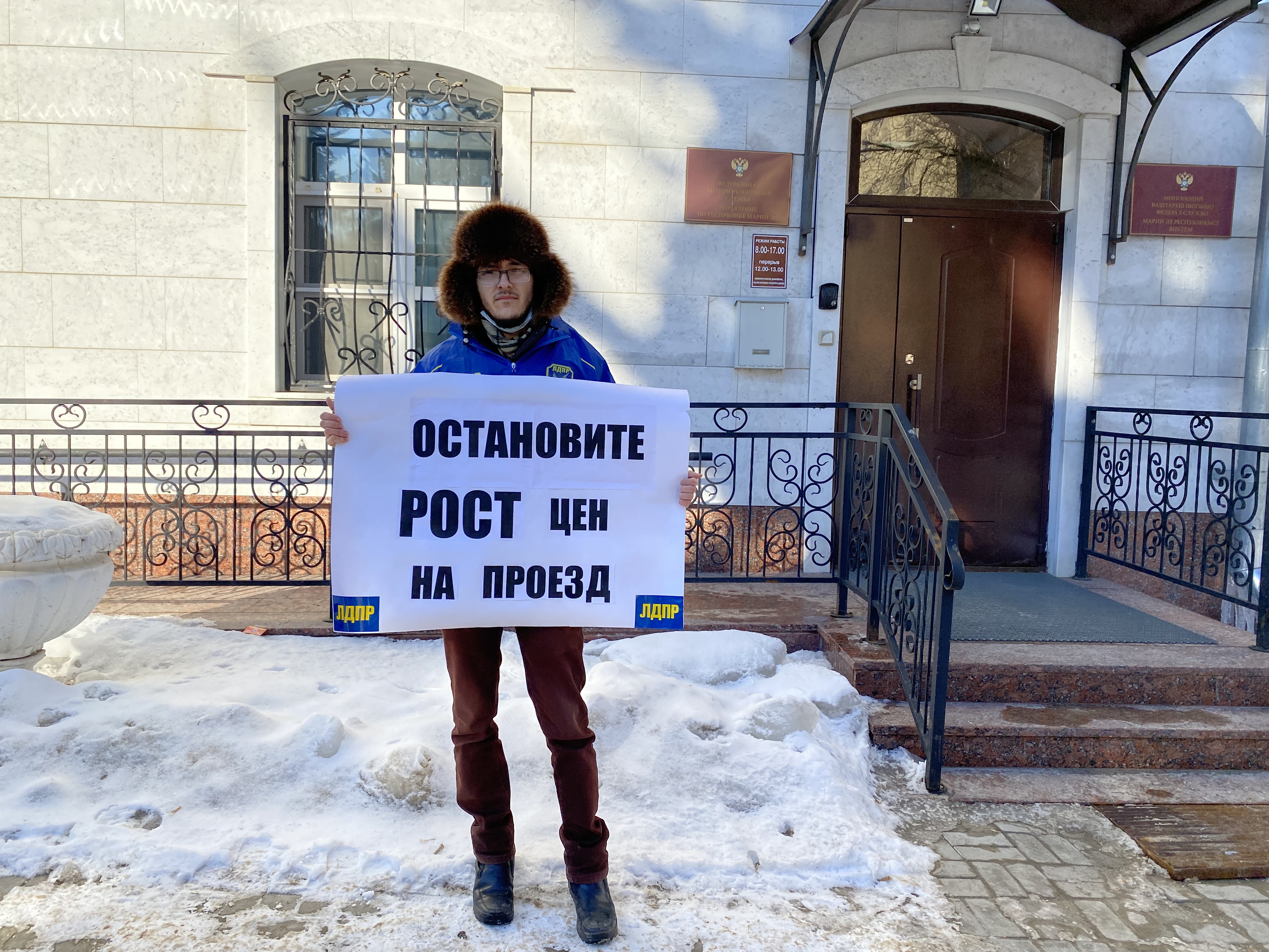 Активисты молодежной организации Марийского регионального отделения ЛДПР провели одиночный пикет в центре города Йошкар-Олы у здания Федеральной антимонопольной службы. Цель мероприятия – обратить внимание антимонопольного органа на проблему повышения стоимости проезда на общественном транспорте.